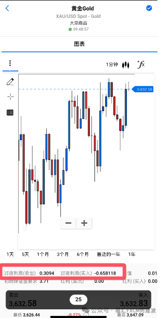 第二个常用的功能就是能实时常看当天的过夜利息,经常交易的品种比如黄金,日元等等,过夜利息有时候是比较高的,甚至周三是收取三倍利息。如果我们当天想持仓过夜,可以先查询下当天的过夜利息,是正数还是负数,是否值得过夜从而决定。比如像黄金每周三的收取三倍利息,有时候1手可能就是100多美金,比较高的时候不建议大家过夜持有。