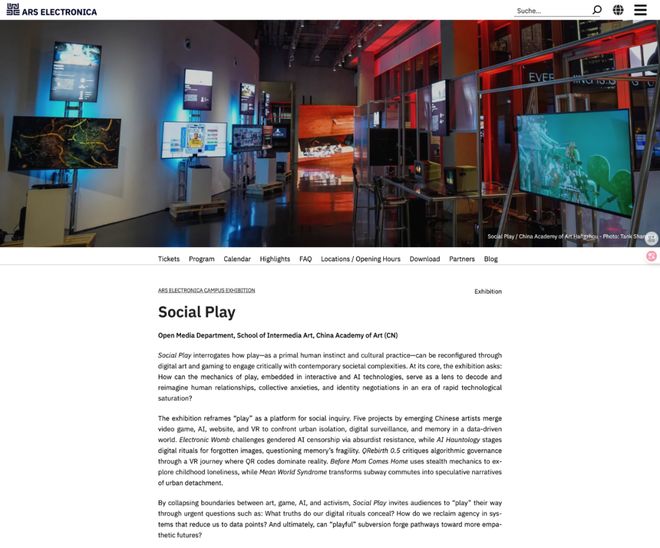 在这种宏大的时代语境下,中国美术学院跨媒体艺术学院开放媒体系的展览《社会游戏》(Social Play)入场奥地利林茨电子艺术节。此展览所提出的核心诘问——“在技术高度饱和的时代,我们应如何将植根于交互技术与人工智能的游玩(Play)机制,作为一面棱镜,去解码并重构被技术渗透的时代中的人际关系、集体焦虑与身份协商?”——与艺术节的年度主题形成了深刻的共鸣。通过将“游玩”重新定义为社会探究的平台,国美团队以一种独特的、艺术驱动的方式,为林茨电子艺术节所提出的全球性“恐慌”命题,提供了一个极具批判性与建设性的回应。
