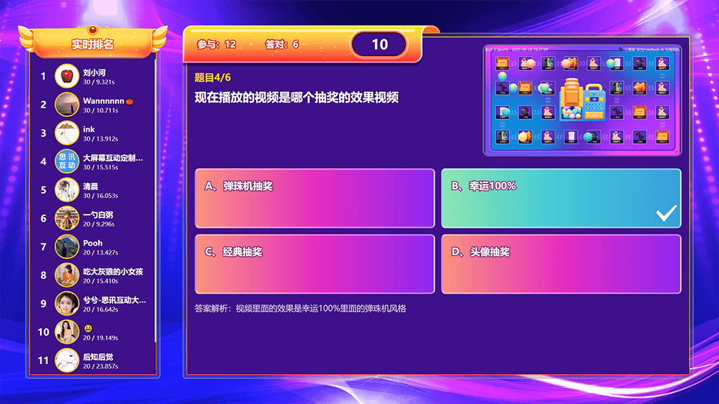 传统的抽奖方式容易显得单调,而数字化的“滚动抽奖”则充满悬念。名字或头像在大屏幕上快速滚动,主持人喊“停”后定格在中奖者身上,过程紧张刺激,极具观赏性。可设置多轮奖项,逐步提升现场热度。